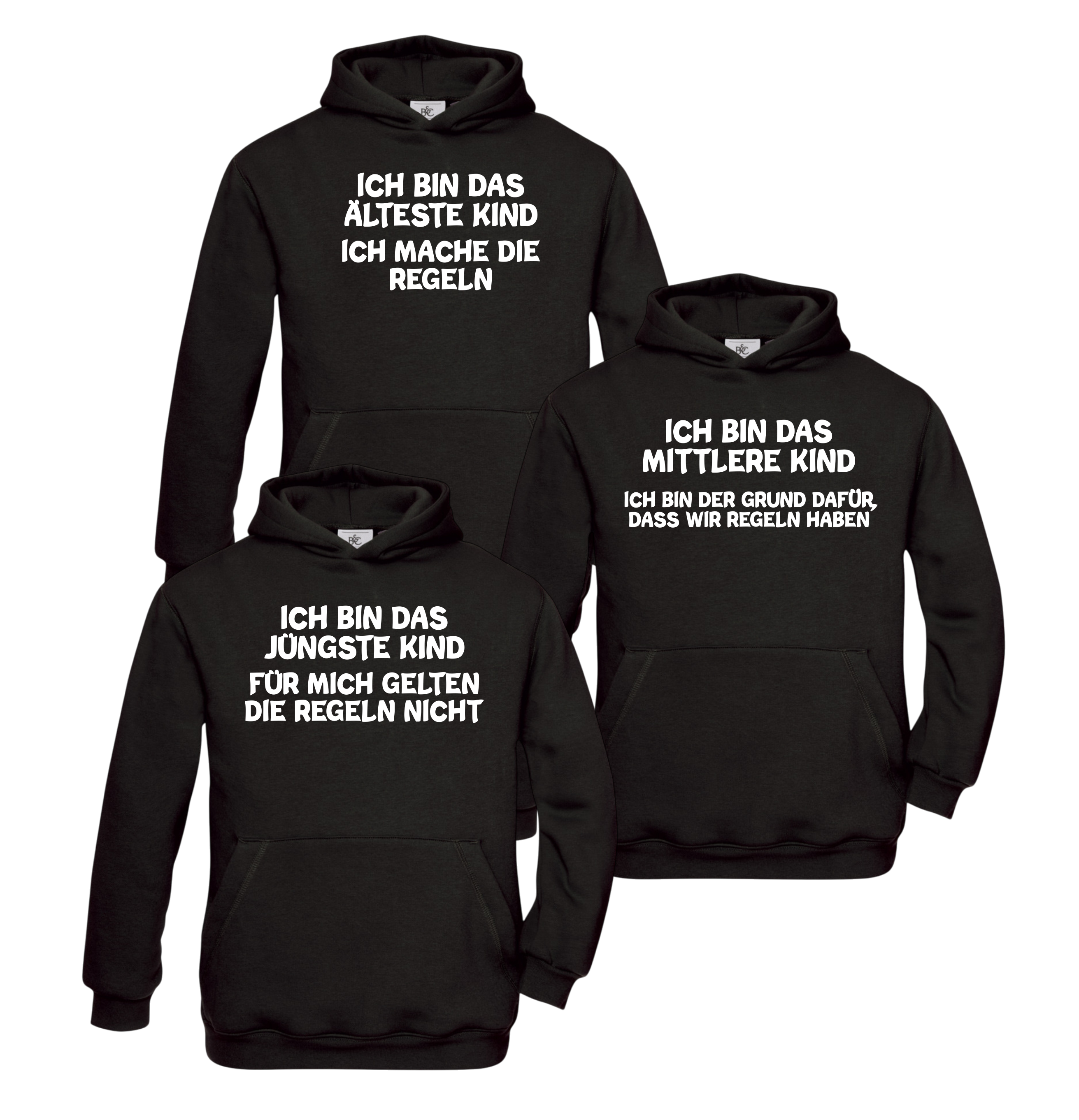 3er Set Kinder Hoodies ohne Kordel, KINDER Kapuzenpullover schwarz "Das Jüngste, Das Mittlere, Das Älteste KiND - REGELN der Familie", Motiv vorne