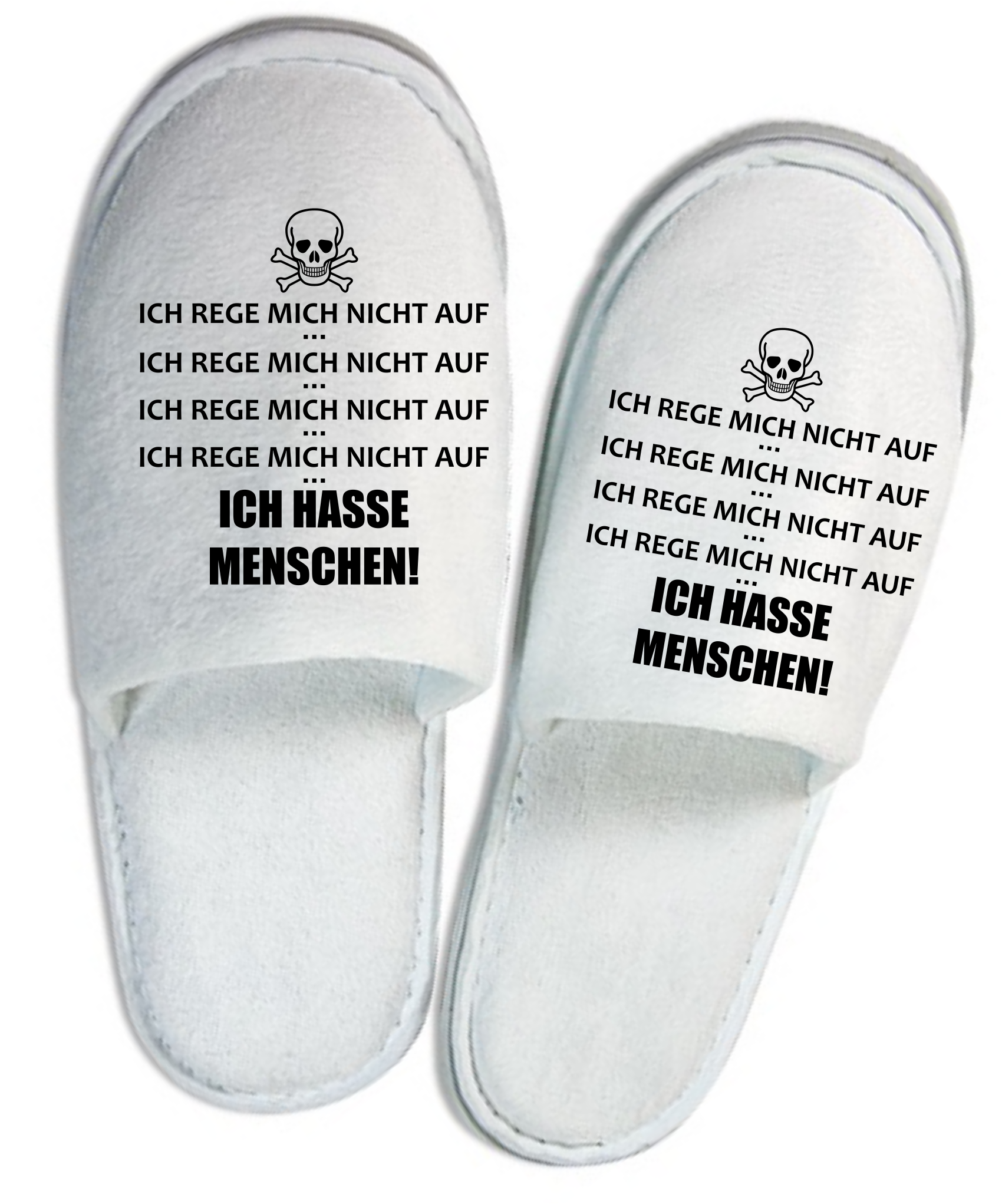 Hausschuhe, Frottee-Slipper weiß mit Motiv: Ich rege micht nicht auf- Ich hasse Menschen,  Einheitsgröße