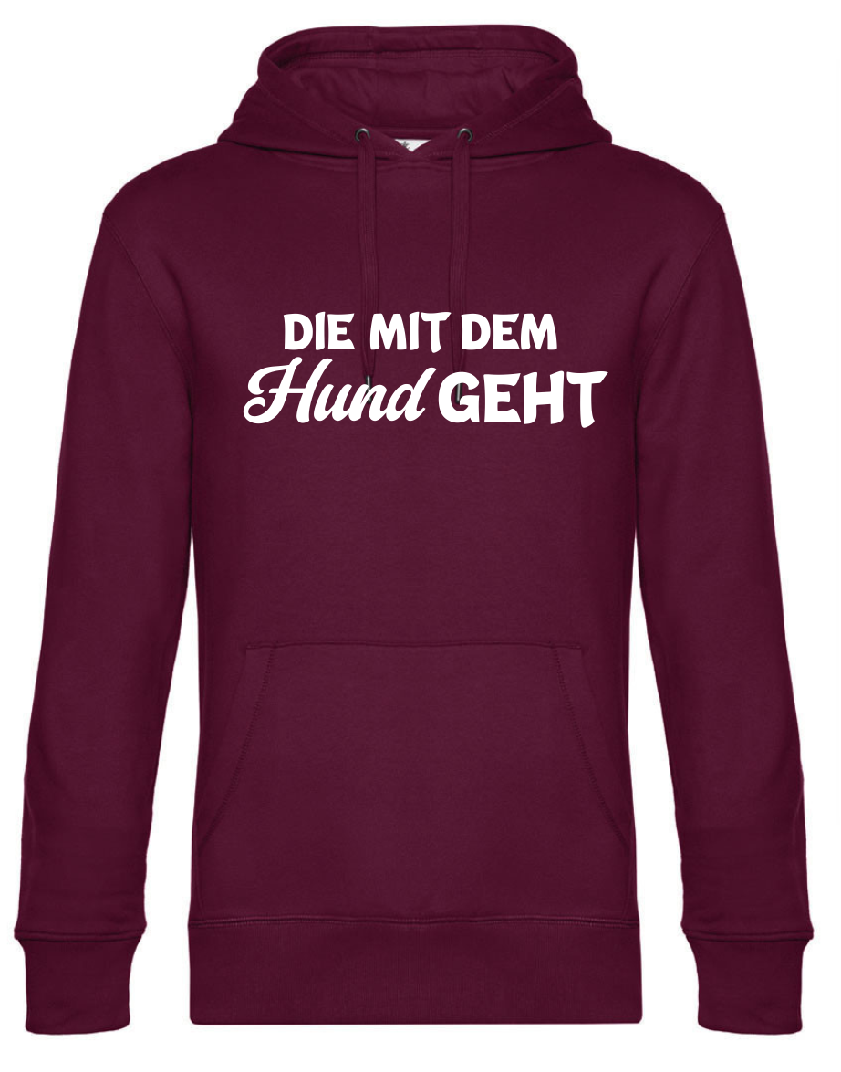 Premium Kapuzenpullover, Hoodie mit Motiv: Die mit dem Hund geht, Farbe nach Wahl