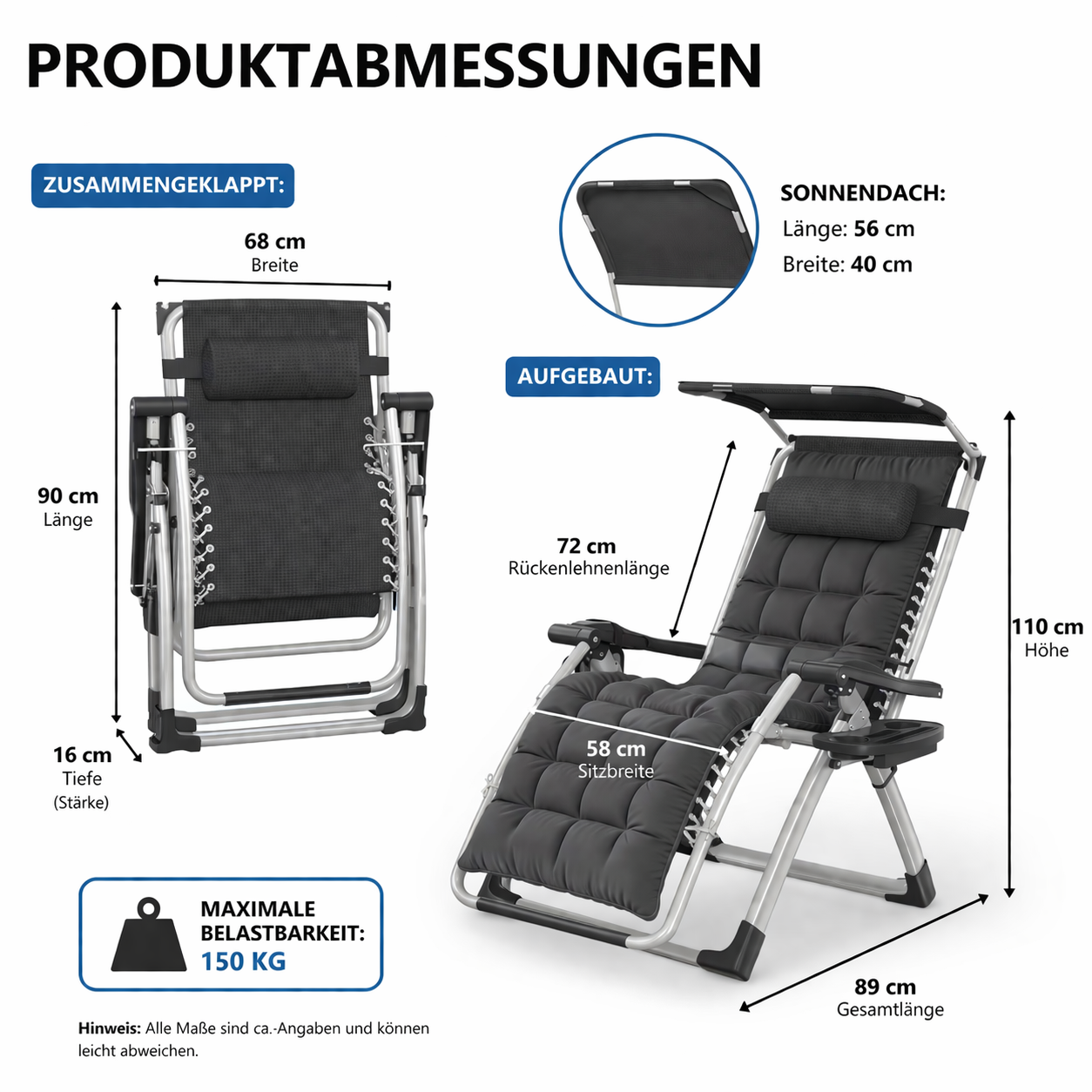 Komfortabler Premium Outdoor-Liegesessel mit integriertem Sonnenschutz, faltbar, inklusive Getränkehalter und Seitentasche – ideal für Garten, Terrasse und Balkon