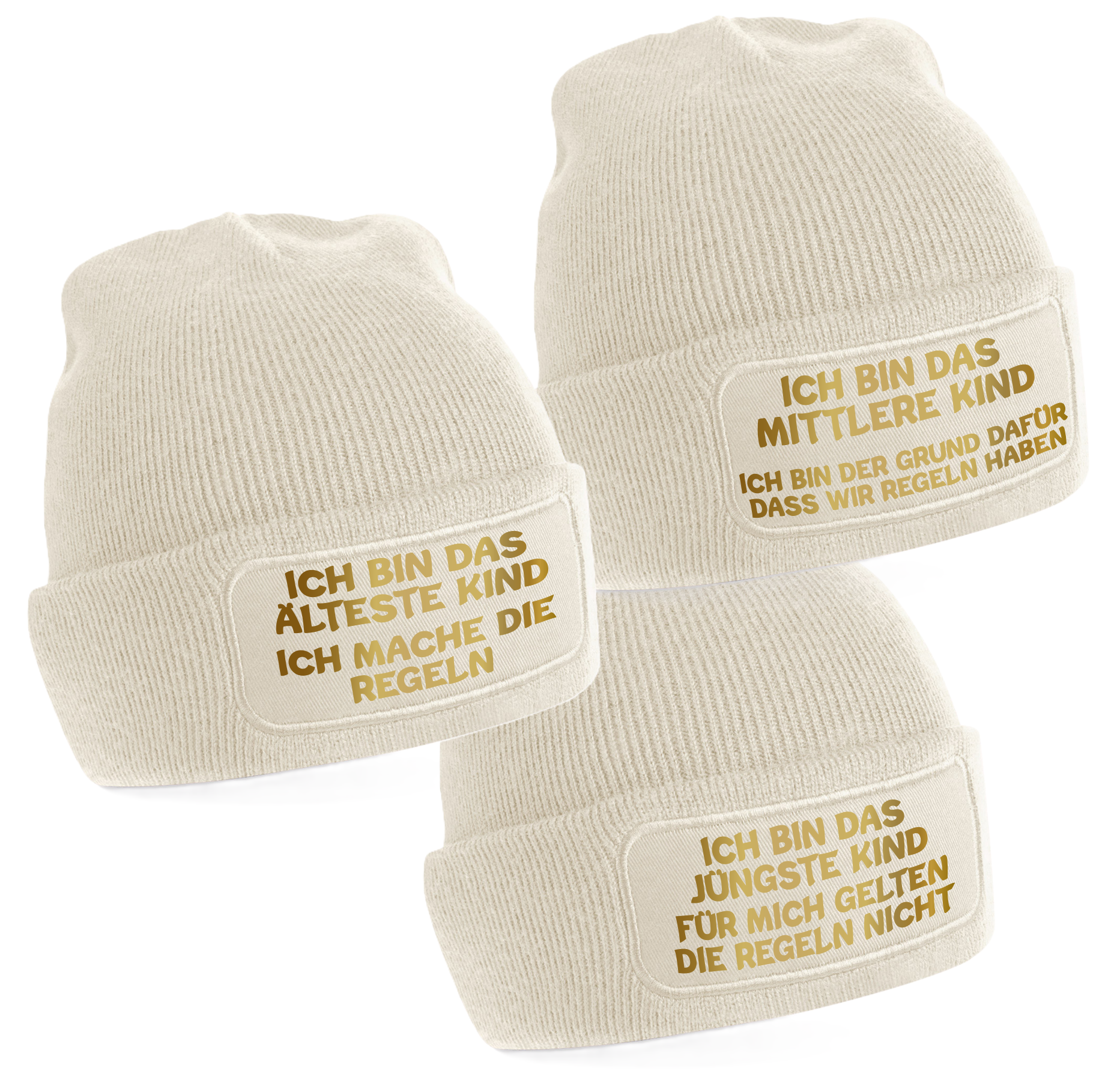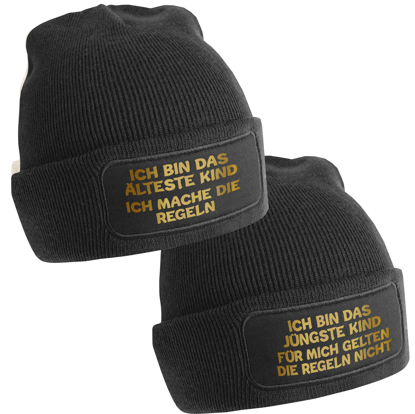 Einzigartiges Design: Schwarze Mützen mit goldenem Schriftzug: Das Jüngste, Das Mittlere, Das Älteste Kind